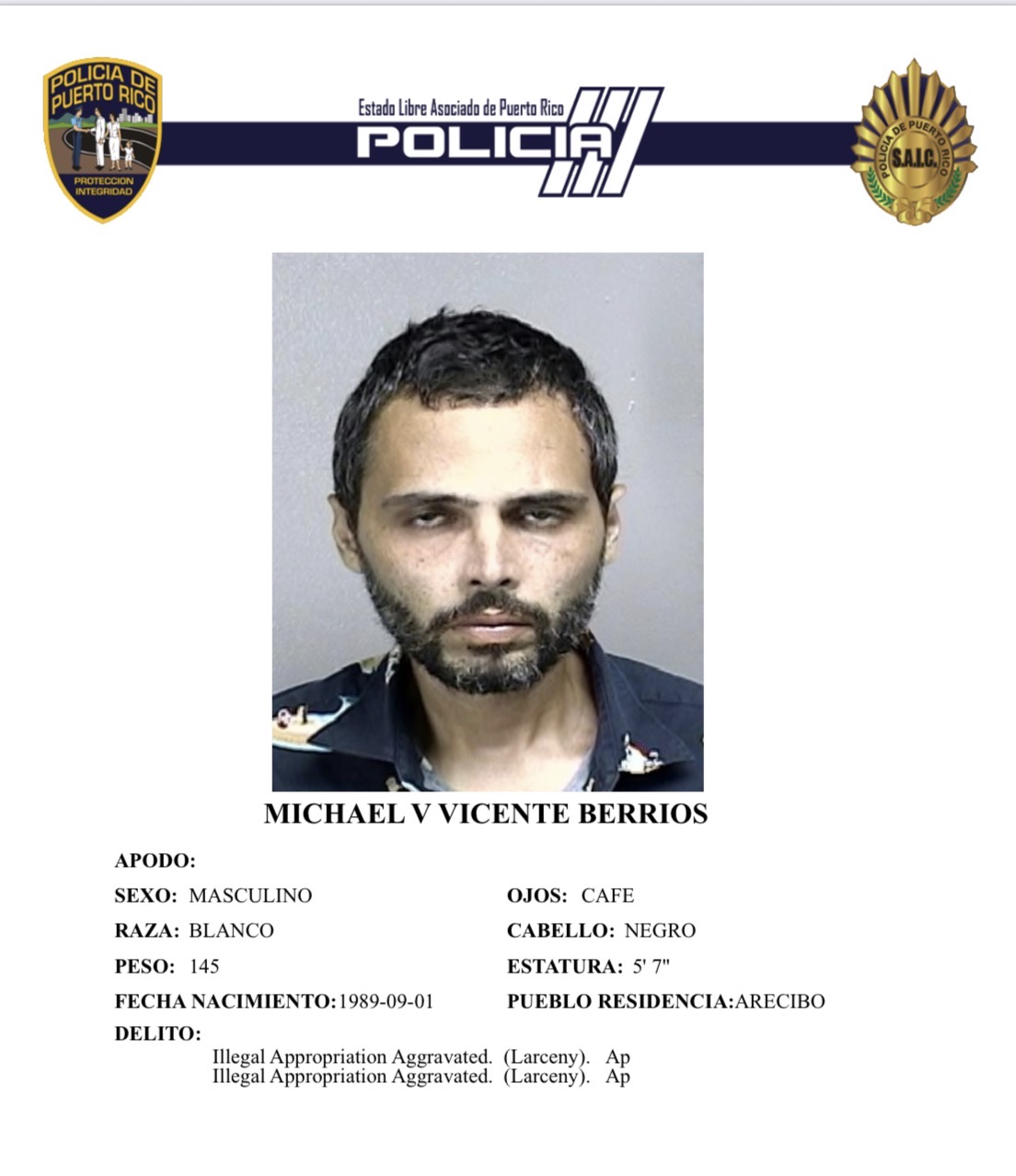 El agente José Cubero González, adscrito al Precinto 107 de Arecibo, llevó a cabo una investigación en la tarde del lunes, en conjunto con la fiscal Daysi Quintero Hernández, de la Fiscalía de Arecibo, quien radicó cargos por los delitos de apropiación ilegal agravada (art. 182) y ratería o hurto de mercancía en establecimientos comerciales (art. 184) delito menos grave del C/P, contra Michael V. Vicente Berrios, de 36 años y residente de Arecibo.